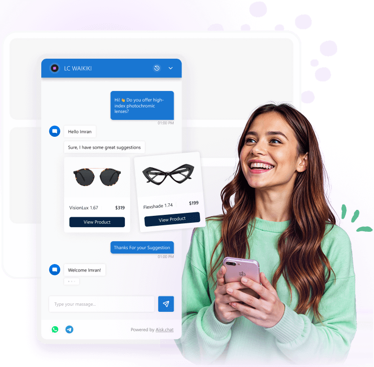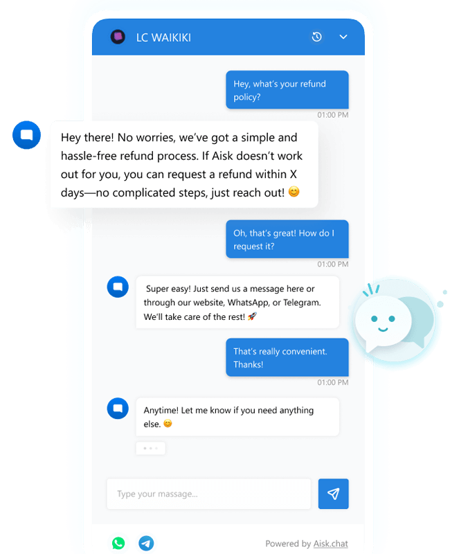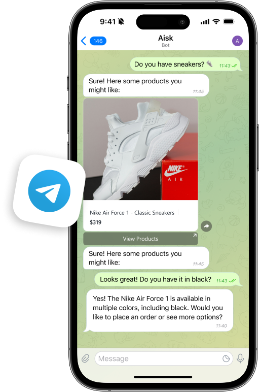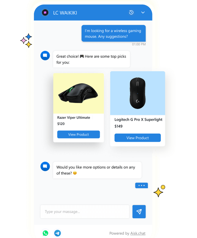 Aisk transforms WhatsApp and Telegram—apps your customers already use daily—into powerful sales and support channels for your business. Customers can ask questions, browse products, check orders, and create support tickets directly through familiar chat interfaces they already know how to use.