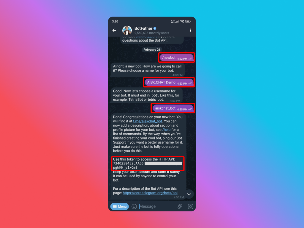 This guide will walk you through setting up Telegram integration for your AISK.CHAT chatbot.