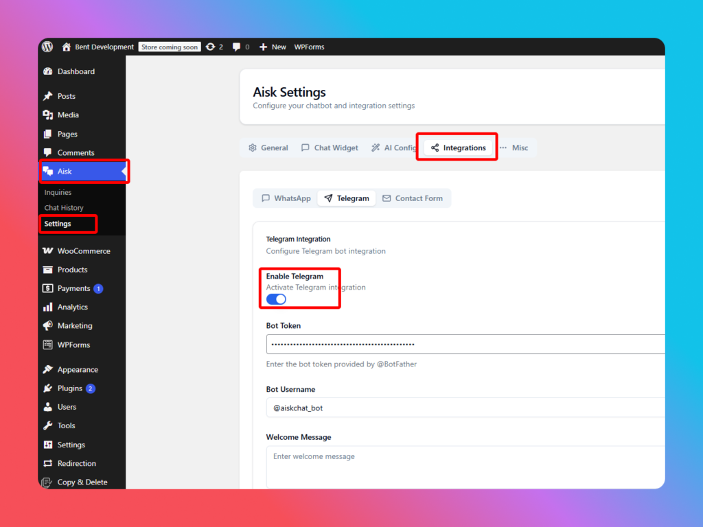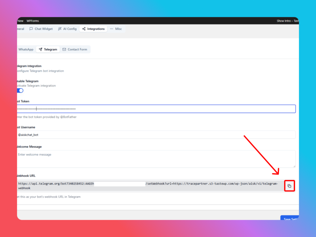 - Enable Telegram integration by checking “Enable Telegram Bot”