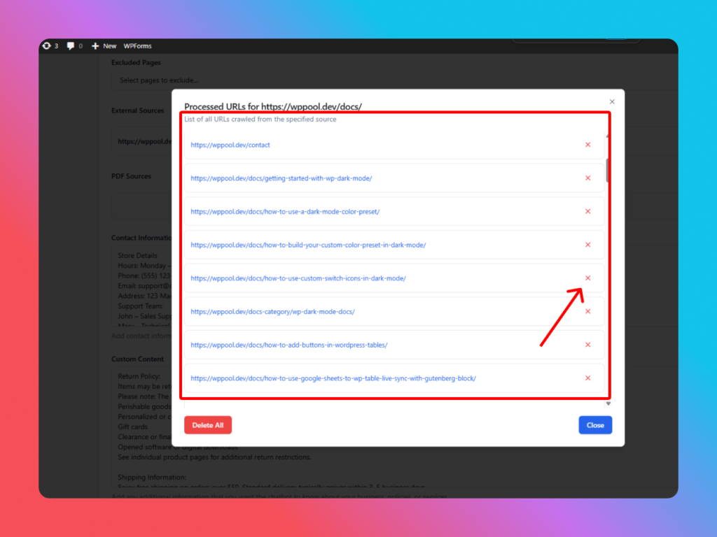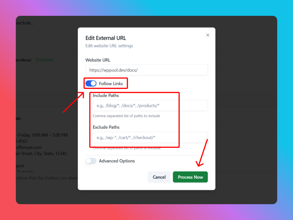 Enable “Follow Links” and Add or Ignore URL Endpoint External Sources(Web URL) as you want. Click the “Process Now” button.